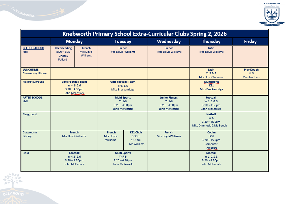 At Knebworth School we aim to offer our children a good range of different activities that they can incorporate into their schedule within the school day, at lunchtimes and after school. We generally find that our clubs are over-subscribed due to the enthusiasm of our children, and we can’t complain too much about that!