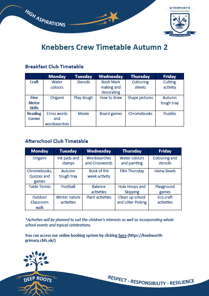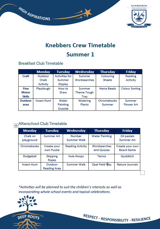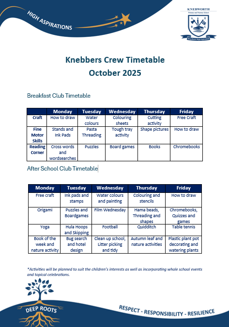For any day-to-day questions regarding Knebbers Crew, please contact Miss Breckenridge via Class Dojo or through admin@knebworth.herts.sch.uk